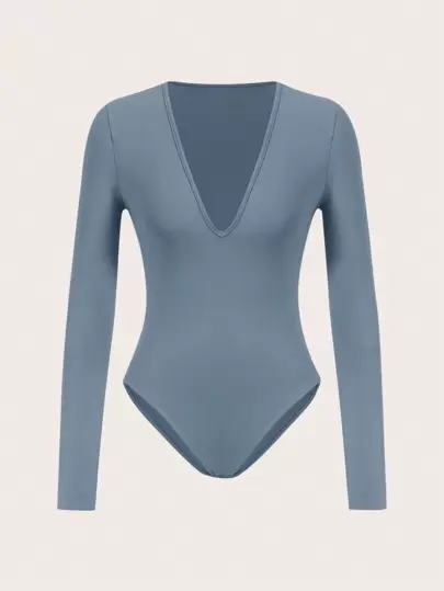 SHEIN BASICS 素色深V領連體衣 - 淺藍色 - 查看 1