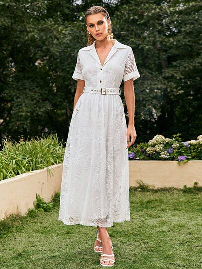 Sollinarry 西裝領腰帶蕾絲洋裝 - 白色 - 查看 1
