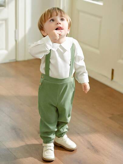 Souflis Souflis 2 件套男婴休闲白色长袖上衣和浅绿色无袖连体裤,秋冬 - 彩色 - 查看 2