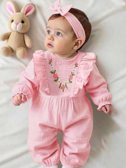 Souflis Souflis 女婴荷叶边花卉刺绣长袖连体裤 - 粉色 - 查看 1