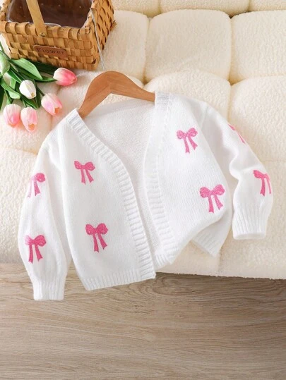 Souflis Souflis 女童单件甜美蝴蝶结刺绣开衫,粉白V领泡泡袖开襟轻薄短款开衫,适合上学和周末外出,春秋季穿着 - 白色 - 查看 1