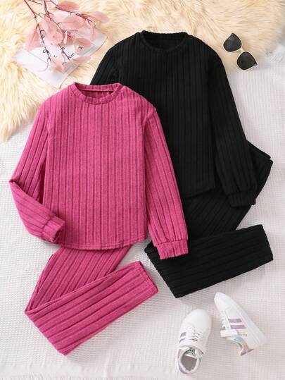 Sparklyn 2 件套 Tween Girls 休闲针织毛绒面料上衣和紧身裤套装,1 件黑色套装和 1 件粉色套装 - 玫紅色 - 查看 2