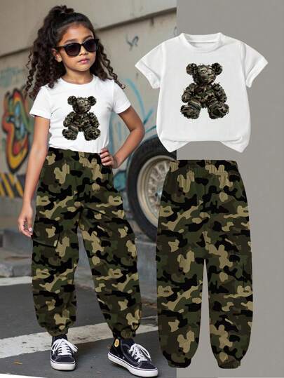 Sparklyn 2 件套青少年女孩休闲迷彩印花 T 恤,带有熊图案和工装裤套装,适合夏季 - 軍綠色 - 查看 2