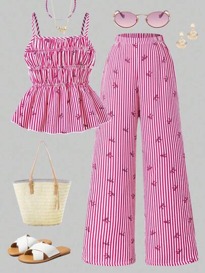 Sparklyn 女童条纹蝴蝶结吊带背心和直筒裤夏季度假装 - 紅色 - 查看 6