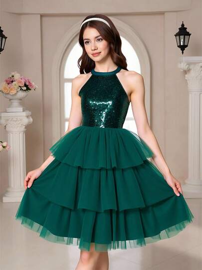 Sparklyn 少女优雅天鹅绒串珠无袖修身网眼蛋糕裙,秋冬奢华派对礼服 - 墨綠色 - 查看 1