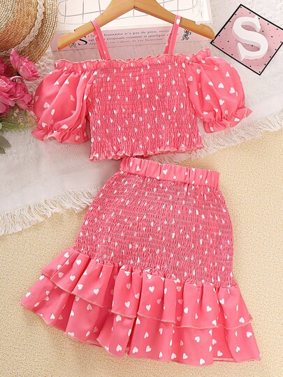 Sparklyn 少女心印花露肩泡泡袖上衣和荷葉邊裙子套裝 - 粉色 - 查看 1