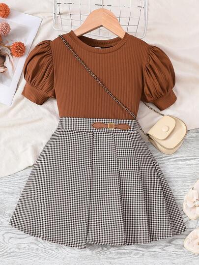Sparklyn 女孩羅紋針織泡泡袖T恤和格紋百褶半身裙不附帶包 - 彩色 - 查看 1