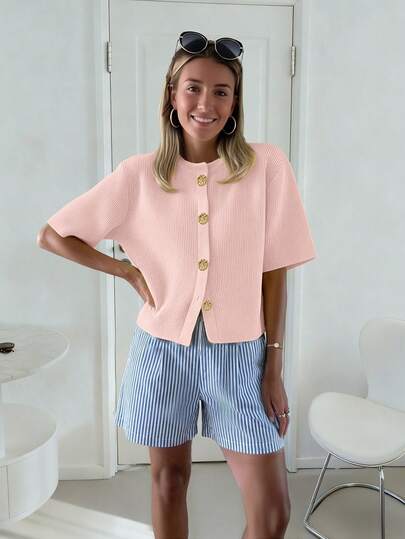 春夏女装时尚法式软蜡质感高端宽松针织开衫,女士短款休闲毛衣上衣 - 粉色 - 查看 1