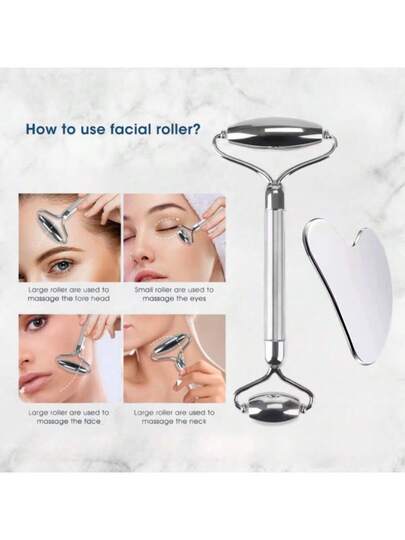 Stainless Steel Facial Roller & Gua Sha - Metal Gua Sha, Gua Sha Facial Tools 304 Stainless Steel, Facial Body Treatment, Puffiness Reduction, Lymphatic Drainage, Facial Tension - Silver-Set Combo