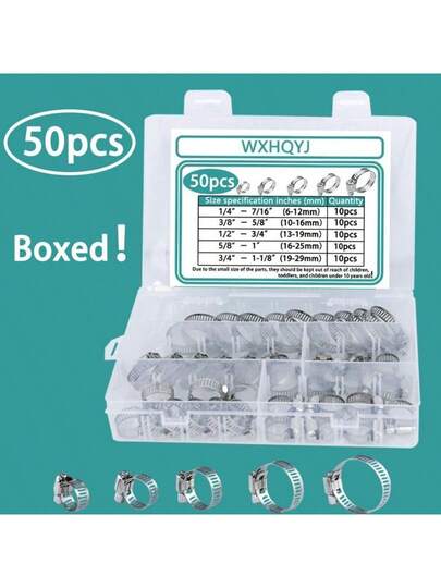不锈钢软管卡箍套装,可调式 1/4 英寸 - 1-1/8 英寸(6-29 毫米),蜗轮式金属燃油软管卡箍,适用于管道、汽车、机械设备 - 50-piece set - 查看 1