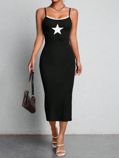SHEIN PETITE 星星印花蕾絲拼接吊帶洋裝 - 黑色 - 查看 1