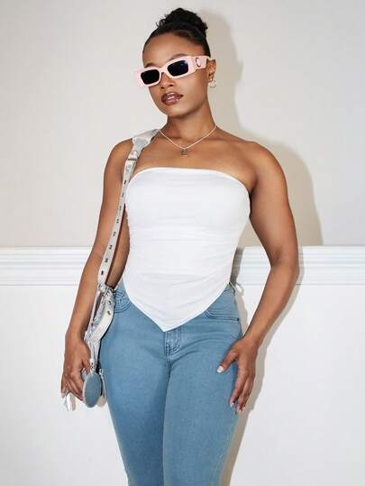 Steph T 不对称下摆露肩上衣,女士休闲不对称,褶皱露肩修身白色纯色女士上衣,春夏,休闲日常穿着 - 白色 - 查看 1