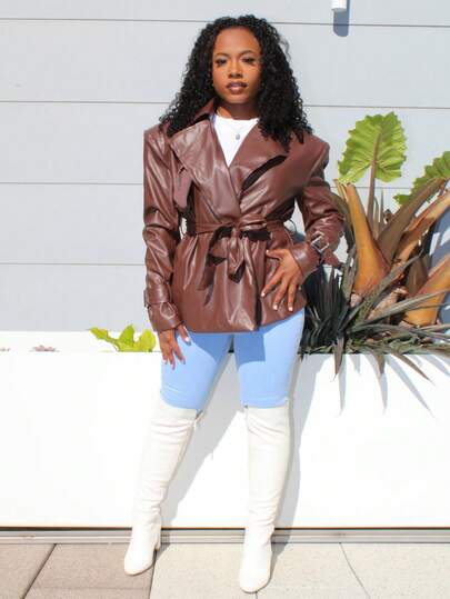 Steph T 女士时尚派对夜出大胆肩部 PU 皮革外套 - 棕色 - 查看 6