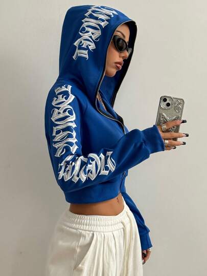StreetHx 女士哥特风文字短款拉链连帽卫衣,秋冬季,长袖上衣,毕业季,返校季,毕业典礼,教师款,女士返校秋季卫衣 - 藍色 - 查看 5