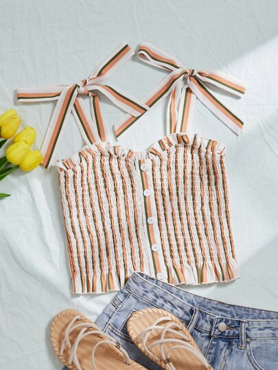 條紋打褶吊帶上衣 - 彩色 - 查看 1