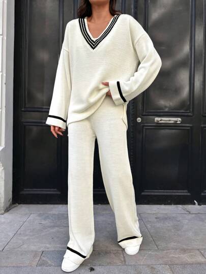 SHEIN Cottnline 條紋飾邊落肩袖套頭毛衣和針織褲 - 白色 - 查看 1