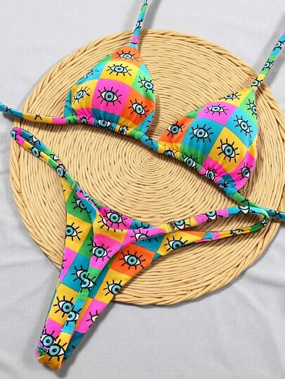 夏季两件套简约格子印花吊带后背可调节腰部女式性感比基尼泳装 - 彩色 - 查看 2