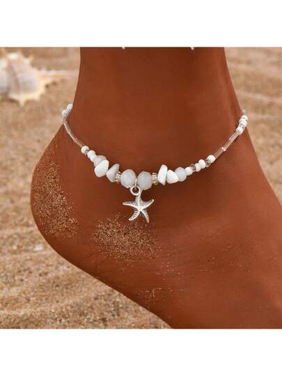 夏季海滩波西米亚风双心脚链,女士时尚贝壳海星脚链,赤脚手工链条首饰,女士波西米亚风不对称串珠海星吊坠脚链,适合日常海滩度假和作为节日礼物 - 彩色 - 查看 6