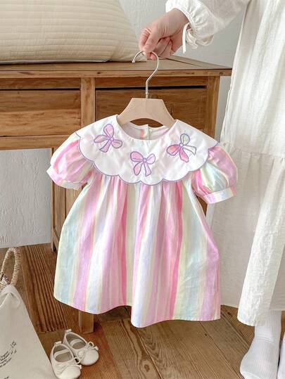 夏季女童宝宝幼儿彩虹条纹刺绣蝴蝶结领休闲舒适可爱女童婴儿连衣裙 - 粉色 - 查看 10