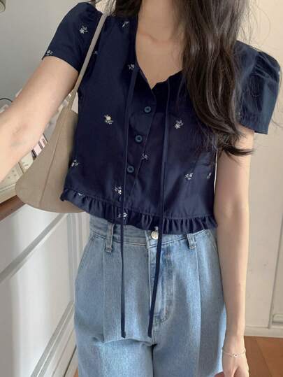 夏季复古小众圆领系带刺绣花卉拼布荷叶边下摆休闲短袖女衬衫 - 藏蓝色 - 查看 1