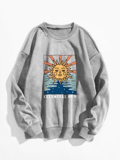 SHEIN Unity 太阳与字母图案超大号保暖套头衫,秋季款 - 灰色 - 查看 1