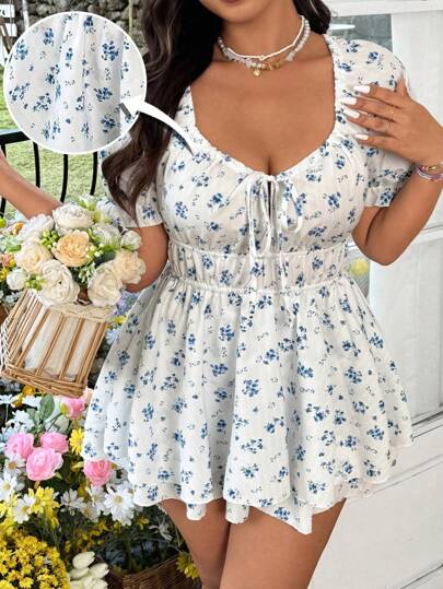Flirla 大码钻石印花抽绳松紧腰短袖连体裤,双层下摆 - 彩色 - 查看 1