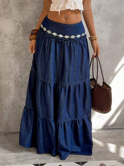 Sunnyshic 女士休闲水洗加长牛仔裙 - 藍色 - 查看 1