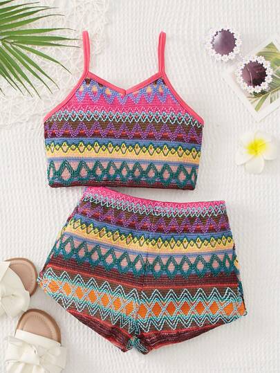 SHEIN 少女地理圖案背心上衣和短褲套裝 - 彩色 - 查看 1