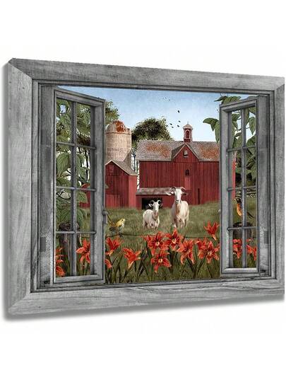 1PCS With Frame Farmhouse Barn Wall Art Grey Window Red Floral Green Plants And Goat Canvas Wall Art Vintage Rustic Wall Art Home Office Decoration Suitable For Bedroom Living Room Dining Study Bathroom Kitchen Hotel Office Apartment Studio Dressing Room Bar Cafe Corridor Wall Decoration - 彩色 - 查看 1