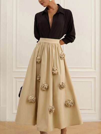 Aveloria 法式复古松紧腰3D花卉装饰A字中长裙 - 卡其色 - 查看 1