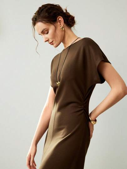 Uhlyne 时尚针织纯色优雅短袖圆领腰部褶饰合身通勤休闲独特连衣裙 - 棕色 - 查看 1