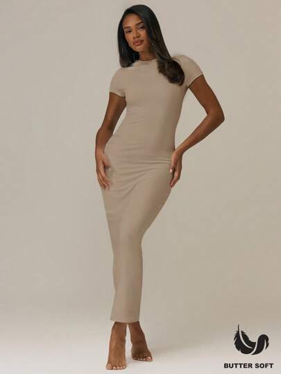 MUSERA ESSENTIALS 柔软如黄油般的短袖修身中长连衣裙,基础款休闲夏季可爱白色连衣裙,适合女士假日、秋季、冬季、圣诞节、新年派对 - 卡其色 - 查看 1