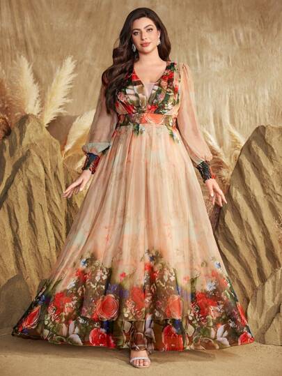 加大码女式甜心领随机花卉印花泡泡袖撞色设计优雅长裙 - 彩色 - 查看 1