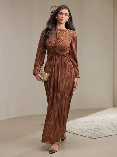 Veilorie 女士优雅纯色扭结腰带褶皱连衣裙,春秋季款,端庄得体 - 巧克力棕 - 查看 1
