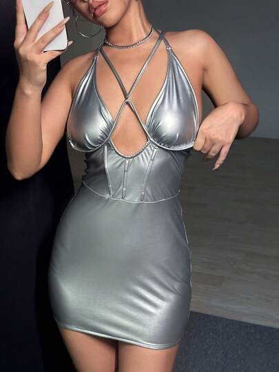 SHEIN Unity 性感露背 交叉 挖空純色女士連衣裙 - 銀色 - 查看 1