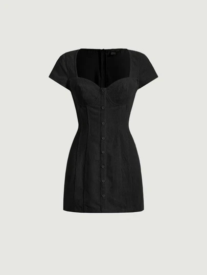 SHEIN MOD 雞心領口前紐扣緊身連衣裙 - 黑色 - 查看 1