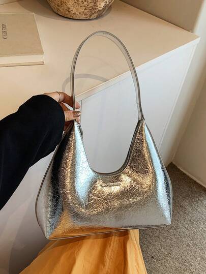 2024 复古简约法式腋下新月包,时尚优雅百搭单肩斜挎法棍包女士手提包 - 銀色 - 查看 2