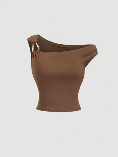 Sweetra 不对称领口修身休闲吊带背心,春夏' - 棕色 - 查看 1