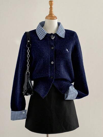 Sweetra 秋冬新款小马刺绣格子拼接二合一时尚宽松学院风长袖开衫 - 藏蓝色 - 查看 1