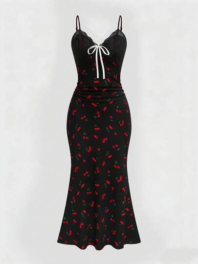 Sweetra 大码女式樱桃印花蕾丝边鱼尾针织长裙