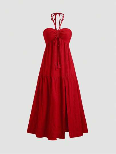 Sweetra 女装连衣裙欧美春夏款新款系带露肩无袖露肩迷人红色露背开衩纹理面料适合度假休闲派对喜庆 - 紅色 - 查看 1