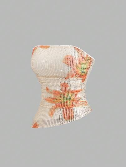 Sweetra 女士新款时尚高街优雅抹胸上衣,性感修身印花串珠优雅派对度假百搭舒适户外黄色抹胸上衣