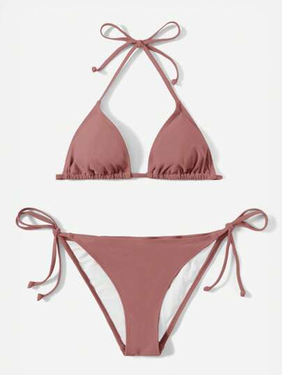 Swim Basics 纯色比基尼泳衣,度假海滩装 - 咖啡棕 - 查看 1