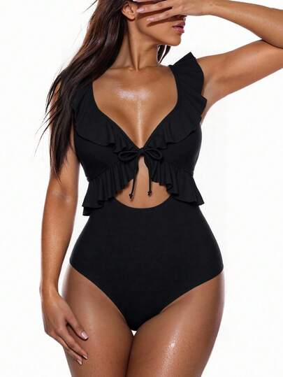 Oceva 荷葉邊鏤空前繫帶連體泳衣 - 黑色 - 查看 1