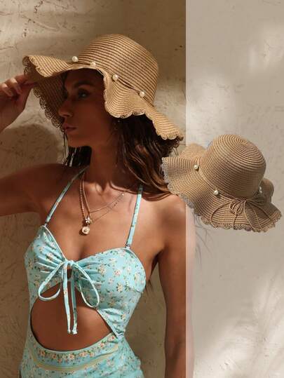 Swim Chiccia 1 件女士卡其色波浪海滩太阳帽,带人造珍珠和蝴蝶结细节,优雅的海滩旅行度假太阳帽 - 卡其色 - 查看 1