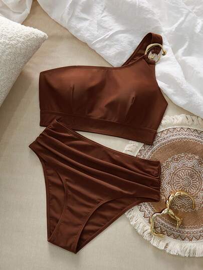 Swim Chiccia 女士纯色金属环装饰吊带泳衣套装,适合夏季海滩穿着 - 棕色 - 查看 1