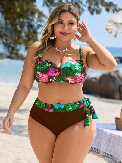 Swim Lushoire 大码女式两件套热带植物随机印花不规则荷叶边上衣和高腰三角泳裤泳衣套装,休闲度假和日常穿着 - 棕色 - 查看 1