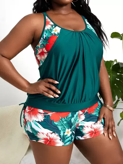Swim Lushoire 大碼熱帶圖案坦基尼套裝褶邊側抽繩背心上衣和短褲2入組泳衣 - 彩色 - 查看 1