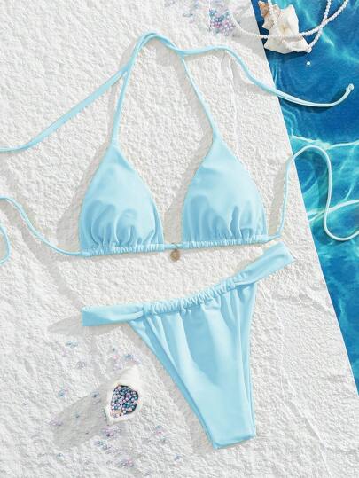 Swim Mod 2 件高腰性感露背吊带前系带女式泳衣套装,夏季 - 藍色 - 查看 1