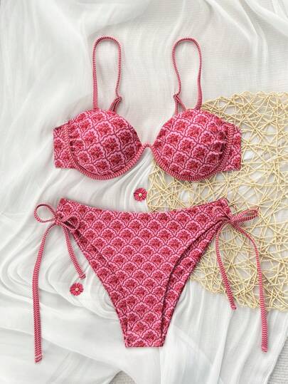 Swim Mod 2 件套女士时尚新款随机印花肩带三角比基尼泳衣,夏季沙滩泳装套装 - 粉色 - 查看 1